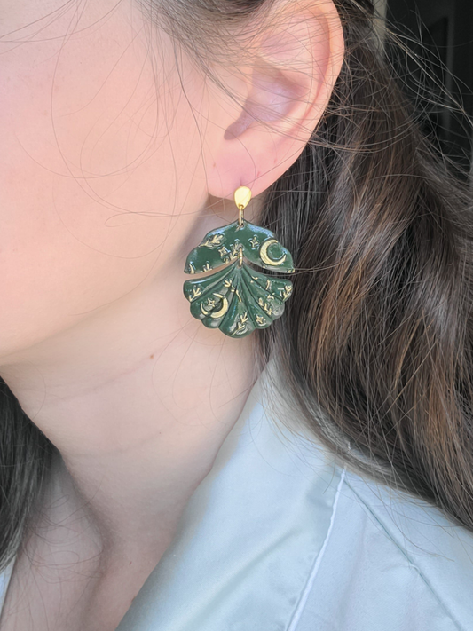 Green and gold textured scallop dangles