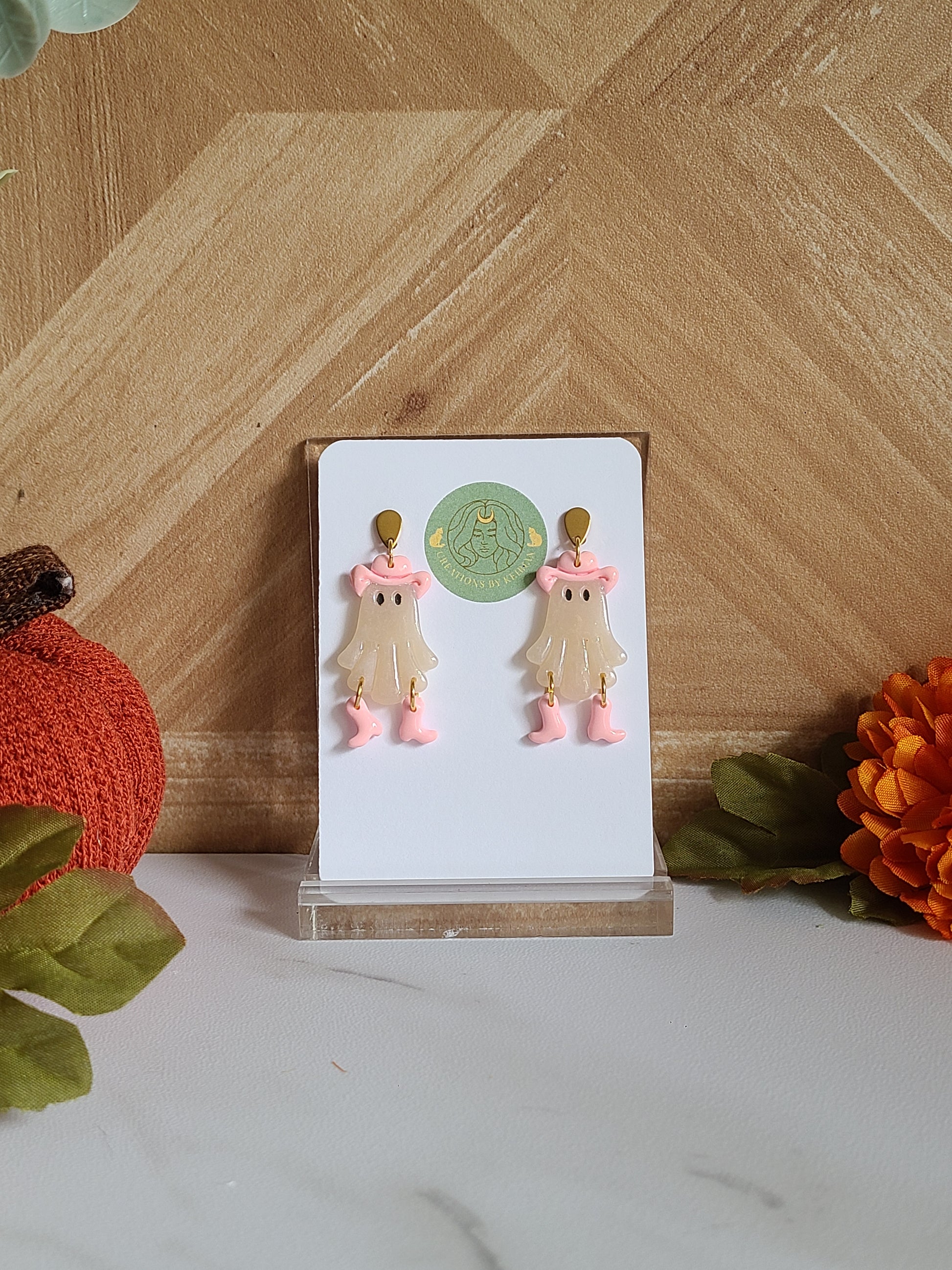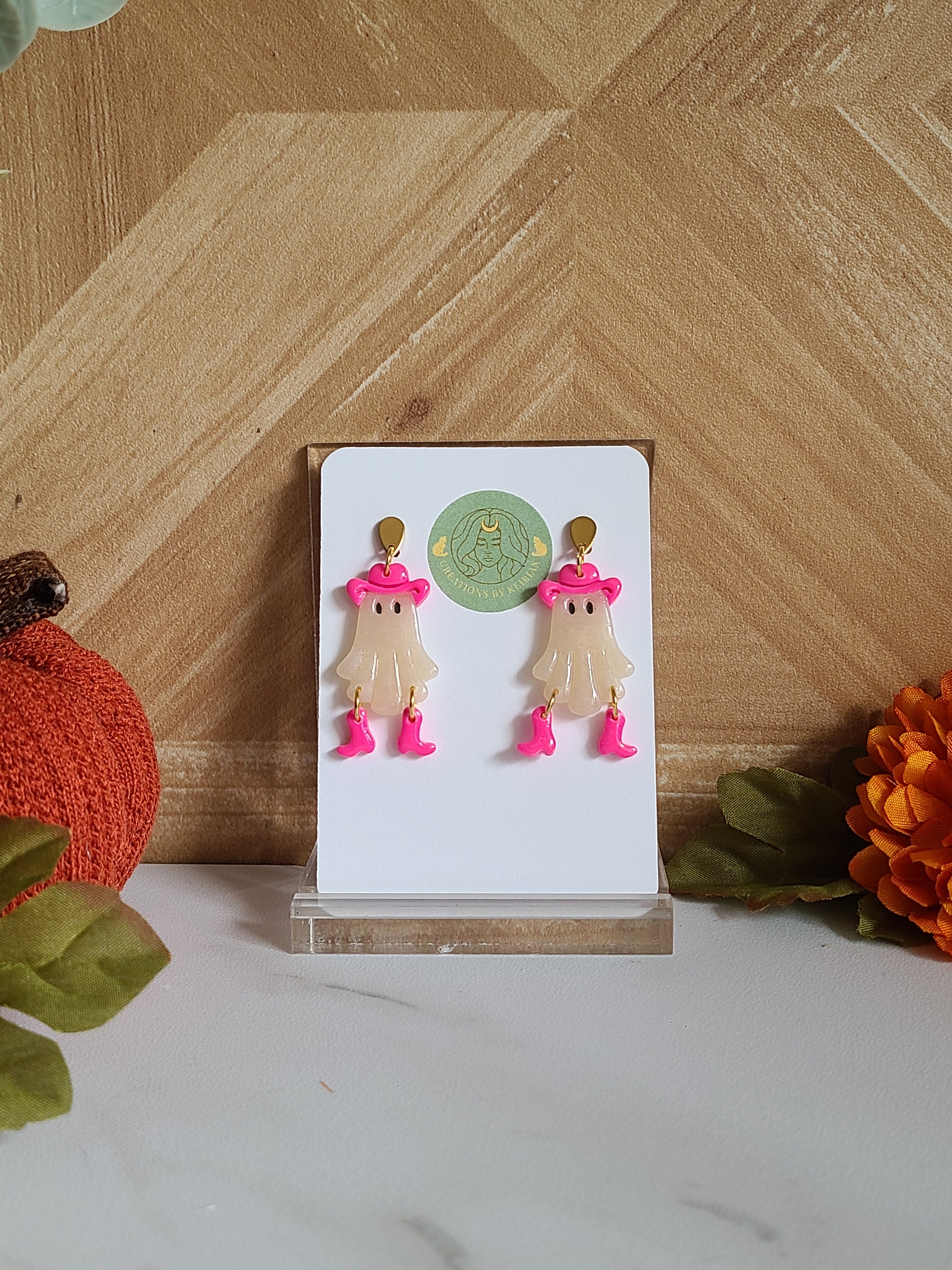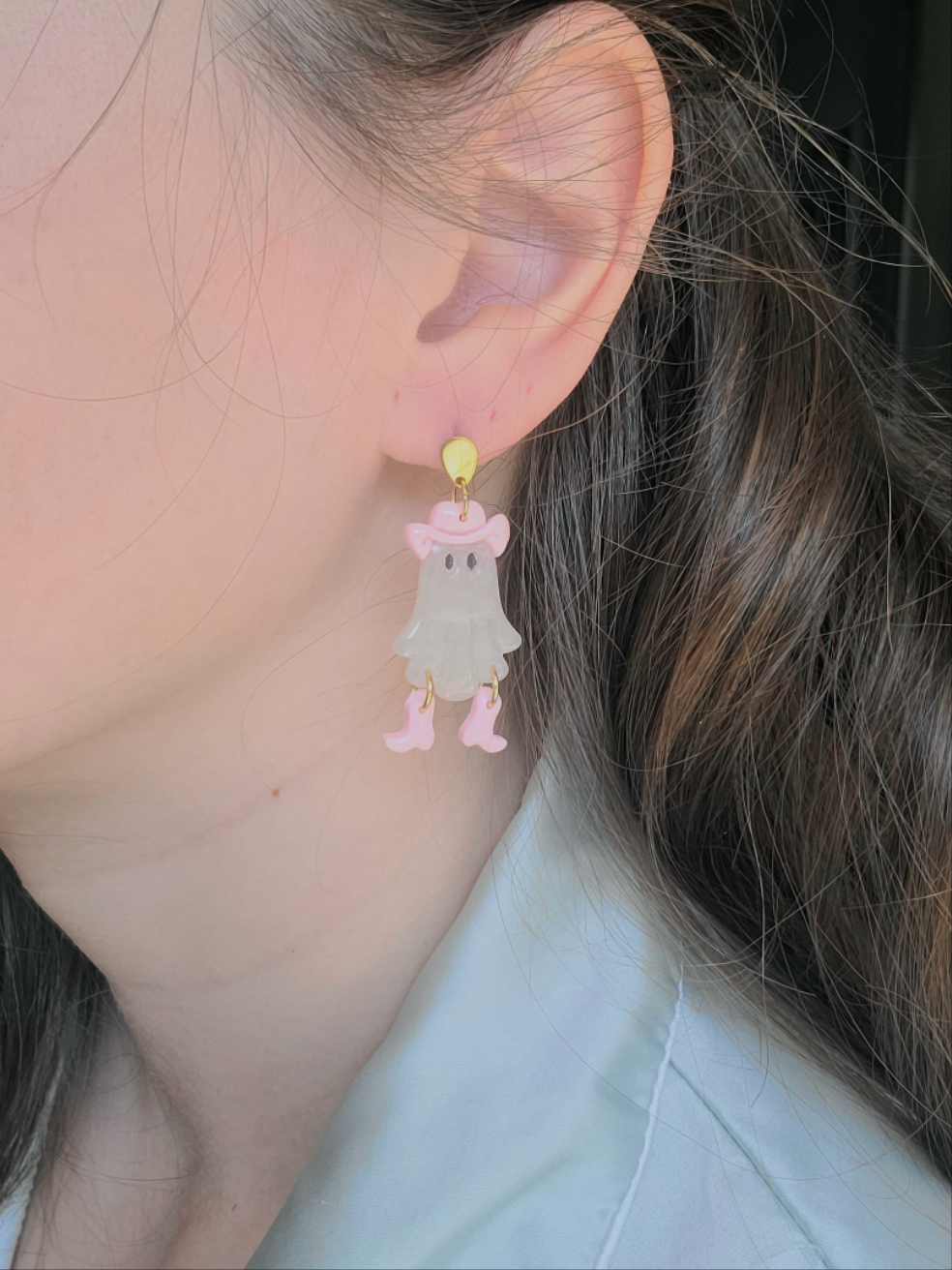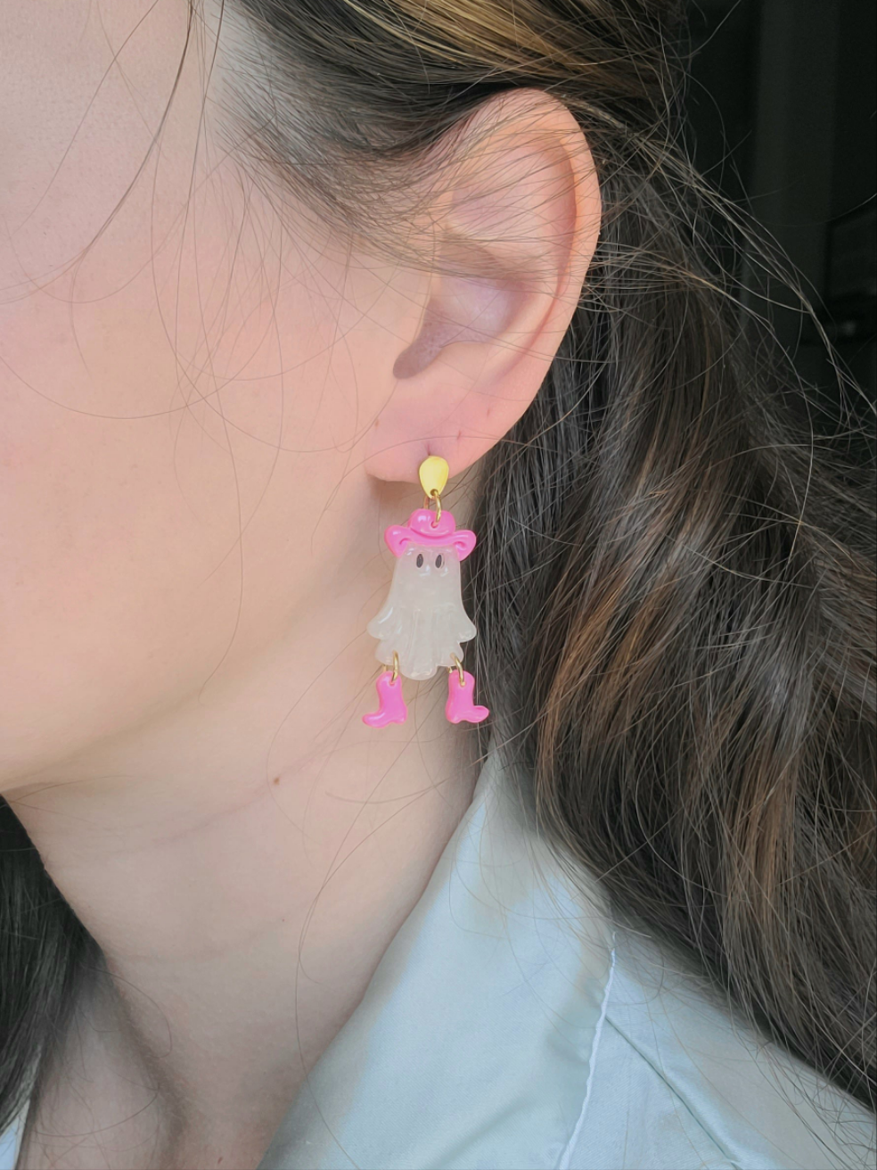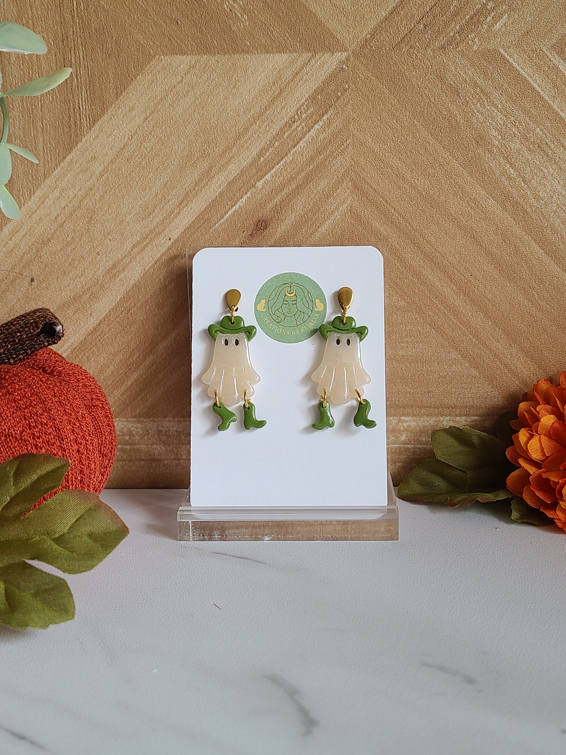 Add a spooky but fun twist to your look with the Cow-boo's earrings! These playful dangles feature vibrant green cowboy ghost designs that dance with every move, perfect for showing off your quirky style. Lightweight and eye-catching, they’re a fun way to celebrate your love for the wild west with a hauntingly cool vibe.