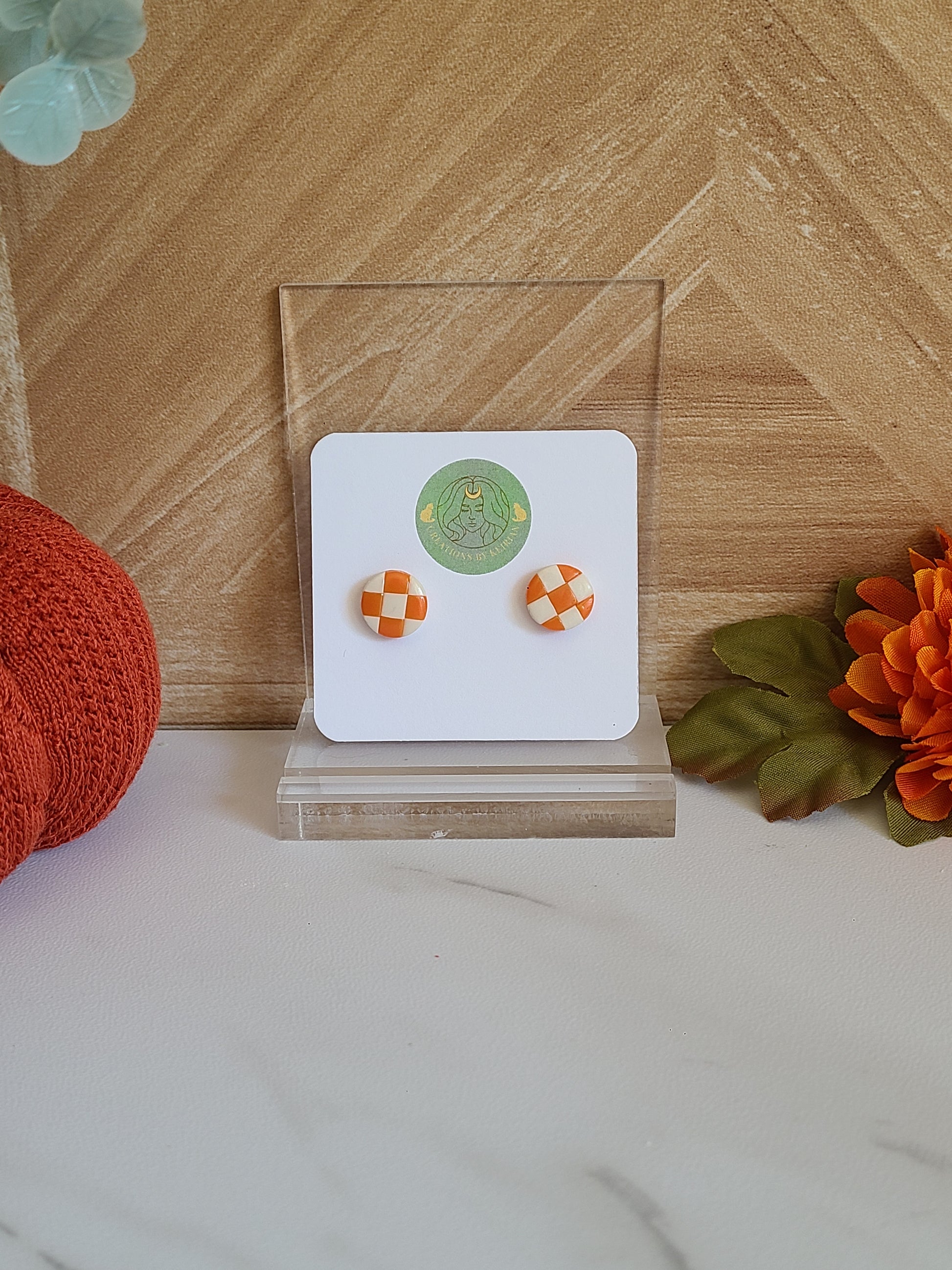 Take your style game to the next level with these playful orange and white checkered studs! With a fun and quirky design, these studs will add a pop of color and personality to any outfit!